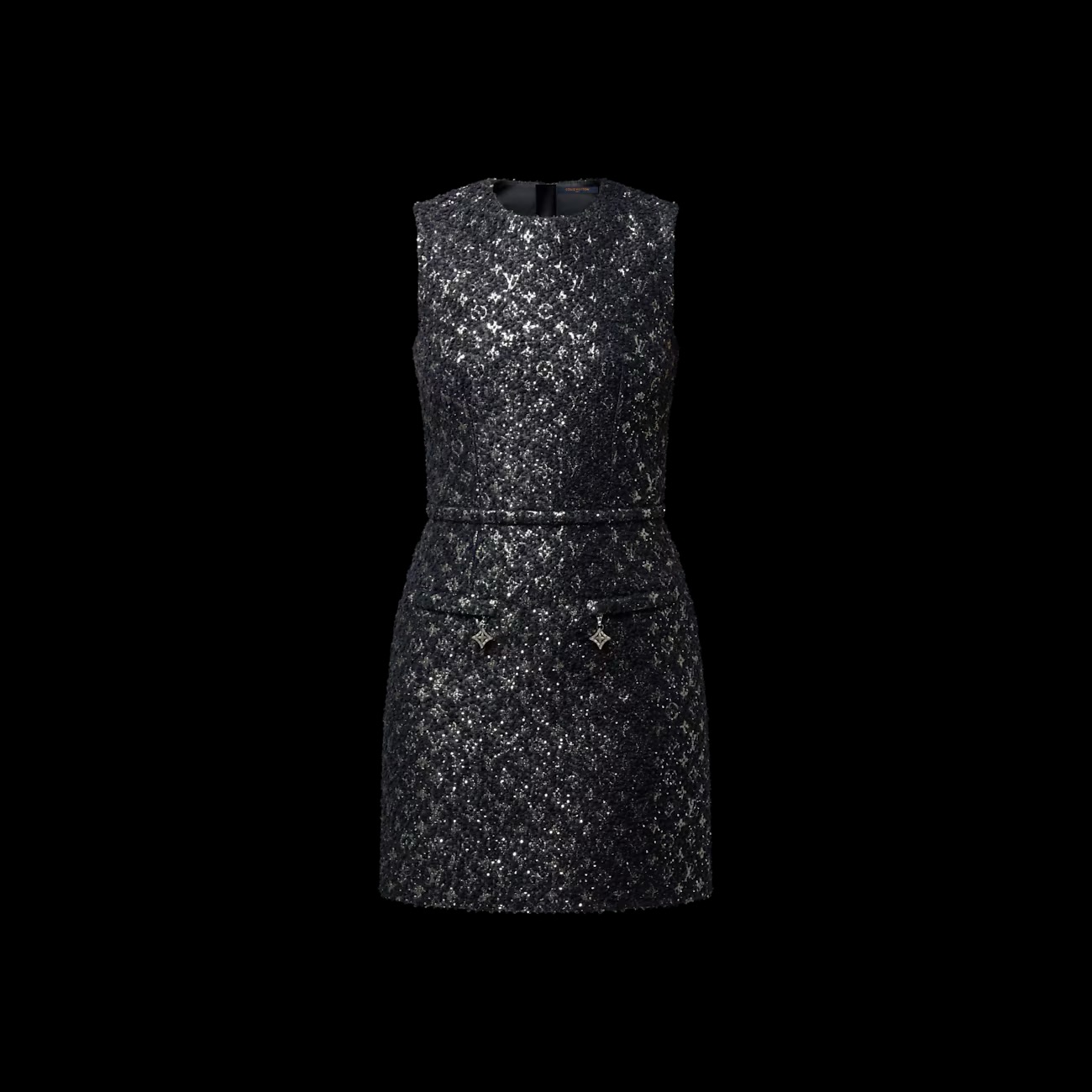 This dress is crafted from a richly textured tweed featuring the iconic Monogram motif in a shimmering finish, while the two fastened front pockets are detailed with signature snowflake zipper pulls. It is cut in an elegant fitted silhouette with a visible seam detail adding definition to the waistline, and an exposed zipper at the back.
