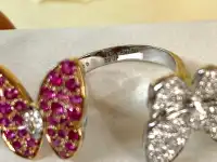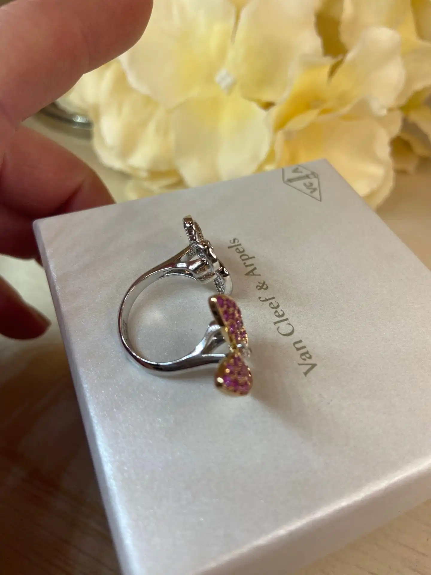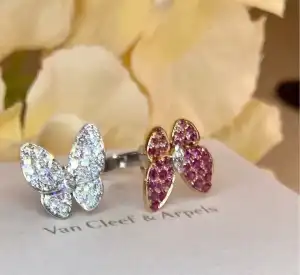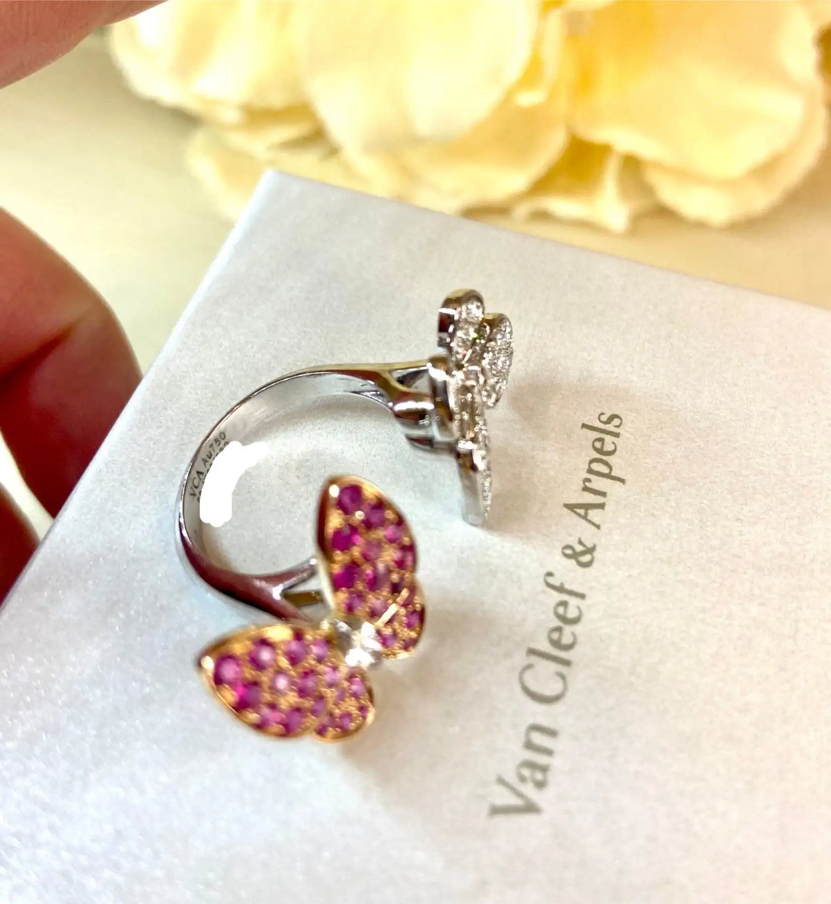 This beautiful Van Cleef & Arpels (VCA) Creation features two expertly crafted butterfly Motifs, made of rich 18KT Rose Gold & 18KT White Gold, and feature 0.34 Carats of Marquise Brilliant Diamonds & 0.65 Carats of Round Brilliant Diamonds on one butterfly motif and 0.88 Carats of Round Faceted Sapphires on the other motif. Stunning!